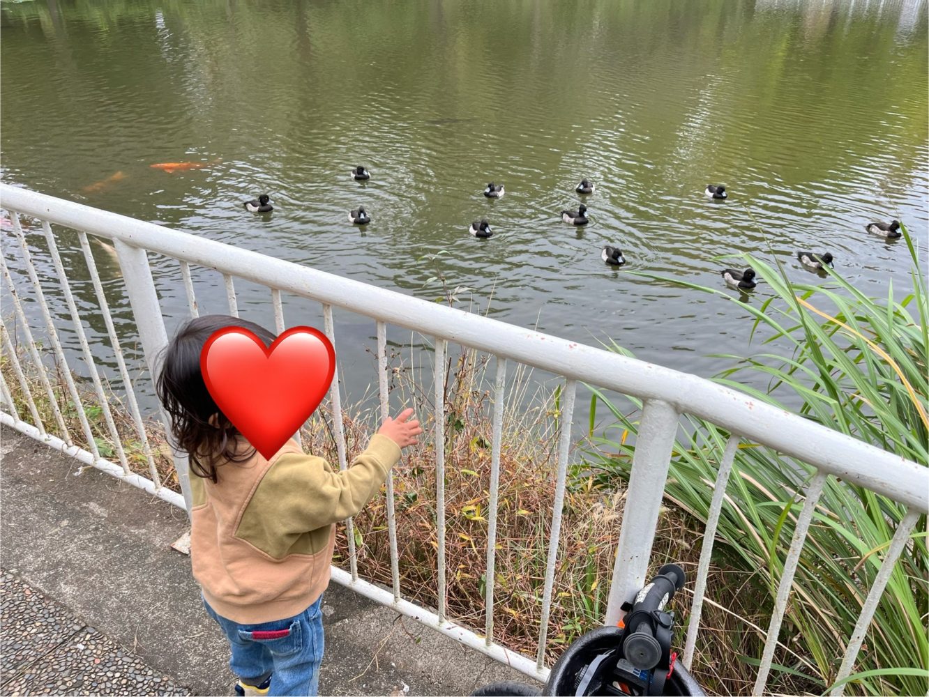 池の鳥や魚に興味津々でした。
