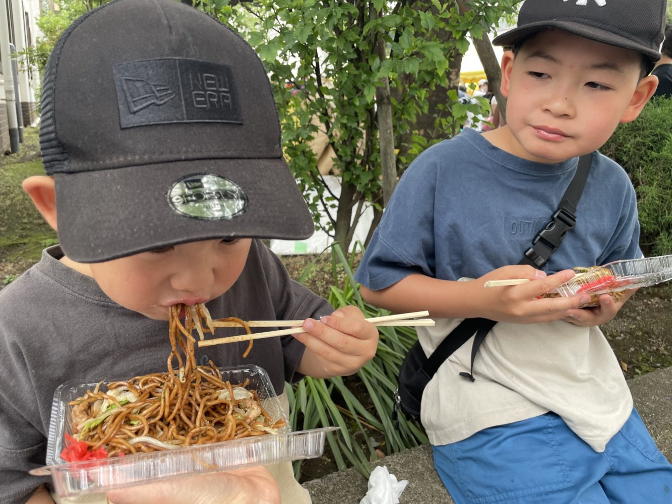 まだ10時だというのにわが子たち、「焼きそば食べたい!」「綿菓子だって~!!」「おまんじゅう!!!」「おにぎりもある!」と食べまくり。