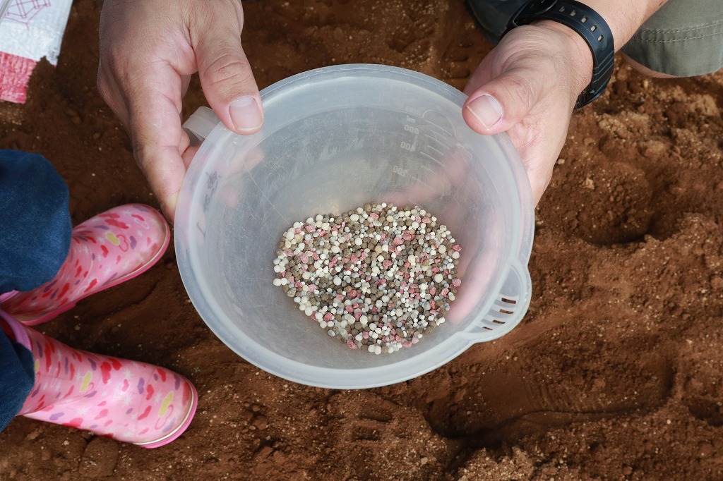 畑の土は農家の方が耕してくださっていたので、ふっかふかです。農家の方の説明に従って、まずは肥料を撒いて畝を作ります。