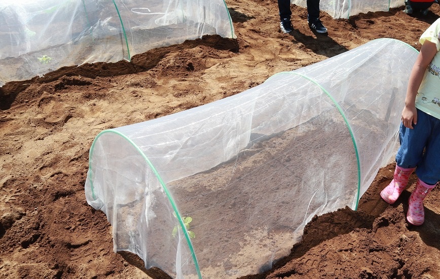 3本の支柱を等間隔にアーチ状に挿して、その上からしっかりとネットを掛けるのですが、隙間があると折角のお野菜に虫がついてしまうため、ネットの裾にしっかり土を寄せて押さえるのが難しかったです。
