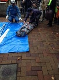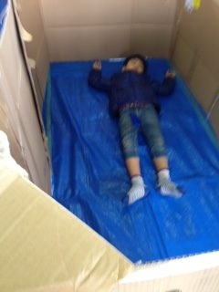 写真は息子が包まれて運ばれている図。(包まれすぎて、顔は見えず)こうすると、1人の力で動かすことができるそうです。他にも、新聞紙で作る簡易スリッパなど、知らないことがたくさんでした。避難場所の小学校に移動して本番さながらの避難カードの記入もしました。