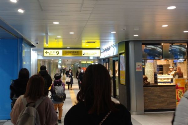 今度は地下から地上(日産スタジアム・横浜労災病院方面)へ向かってみました。東急新横浜駅「南改札A」を出て左へ地下通路を進むと、出口9、10があります。出口9より出口10のほうがより日産スタジアムに近い位置にありました。