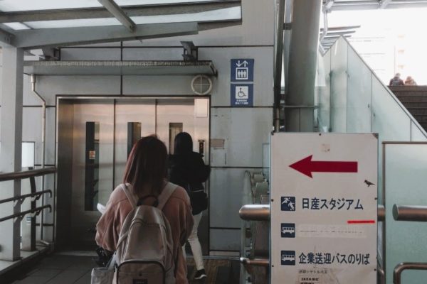 まずは東海道新幹線・横浜線が通るJR新横浜駅からのベビーカー移動をレポート!JR改札からバスのりば方面へ、歩行者デッキへあがるエレベーターに乗ります。このエレベーターはベビーカーが2台並んでも余裕の広さでした。