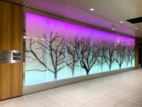 新綱島駅の改札は一か所。改札の中にとってもきれいなモニュメント(デザインウォール)がありました。鶴見川と綱島名産の桃をイメージしているそうです。