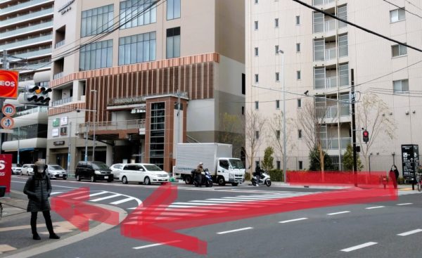 ②綱島交差点の横断歩道を渡って右へ(直進することもできますが、歩道が狭いのでベビーカーでの移動は難あり)