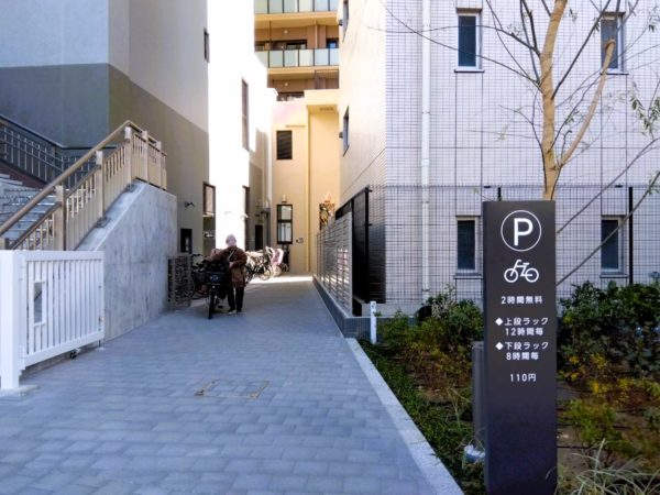 「新綱島スクエア」の駐輪場は148台収容(2hまで無料、以降上段8h・下段12hごとに100円)。入り口からは見えにくいですが、建物の中まで停められて平日午前中でも余裕がありました。