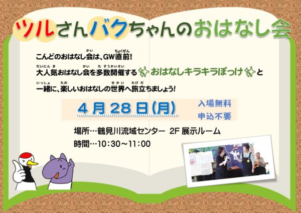 おはなし会開催のお知らせです。 「おはなしキラキラぽっけ」さんによるおはなし会が開催されます。 日時 4/28(月)10:30~11:00 会場 鶴見川流域セン […]