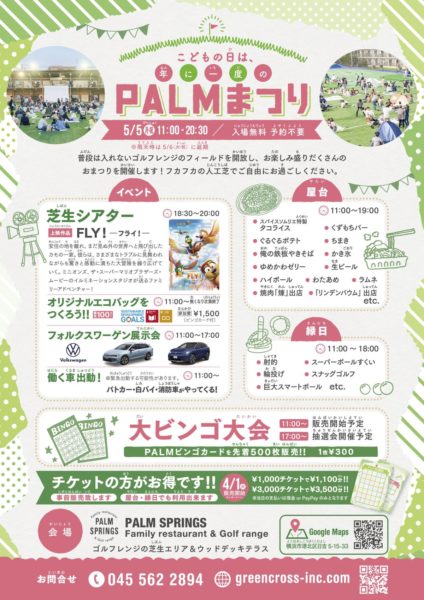 5/5(月・祝)こどもの日は毎年恒例の【PALMまつり】!ゴルフレンジのフィールド、駐車場、テラス席を大開放し『屋台』『縁日』『イベント』ありの【こどものための […]